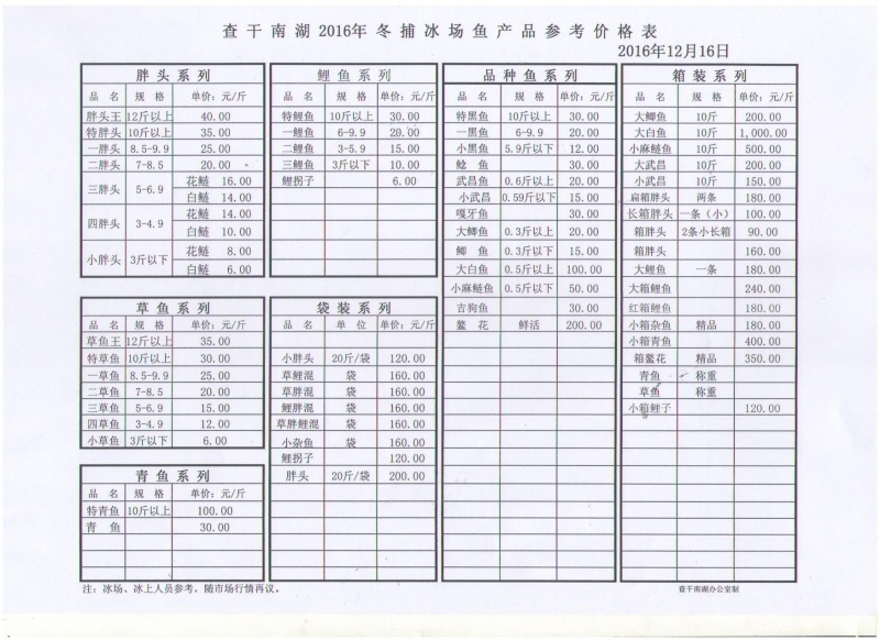 查干南湖2016年冰场鱼产品价格表